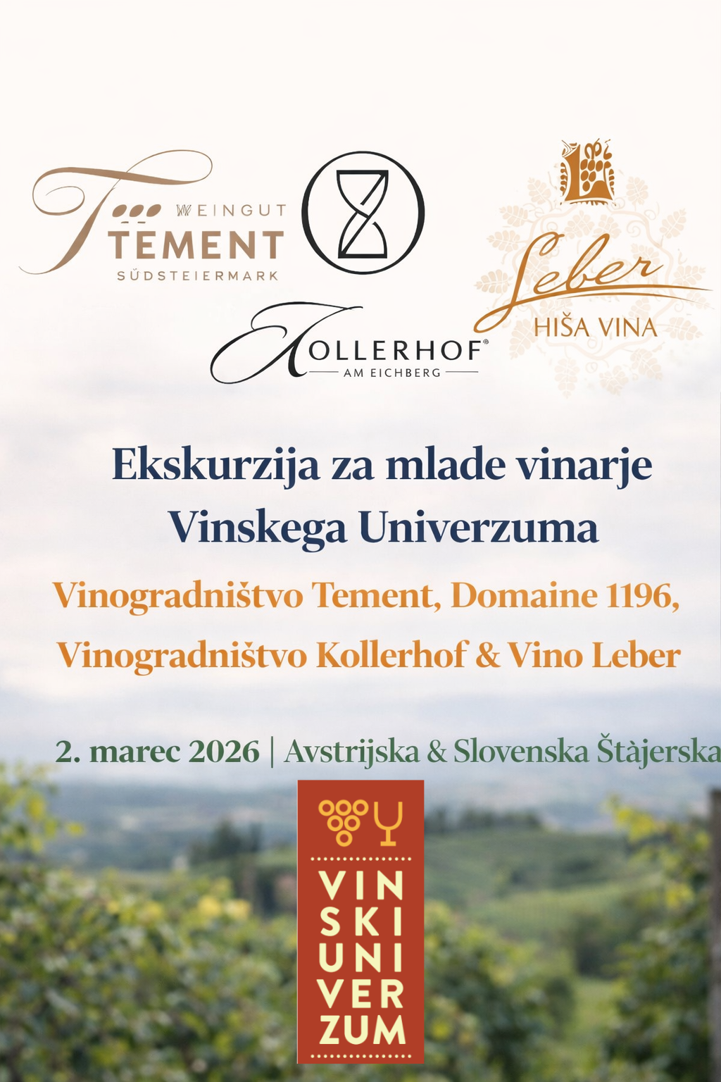 Vabimo vas, mlade vinarje iz vseh koncev Slovenije, na edinstvno enodnevno strokovno vinsko ekskurzijo na Štajersko, ki bo potekala v ponedeljek, 2. marca 2026. Obiskali bomo štiri inspirativne kleti – tri v Avstrijski Štajerski in eno slovensko v Svečini – kjer bomo spoznali različne filozofije pridelave, tehnologije, velikosti vinogradov in kapacitete kleti ter načine povezovanja vina, gastronomije in turizma.
